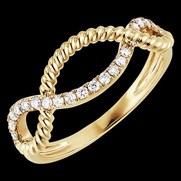 Un Anillo donde se entrelazan dos hilos dorados, oro amarillo y oro amarillo pavimentado con diamantes como un abrazo eterno.