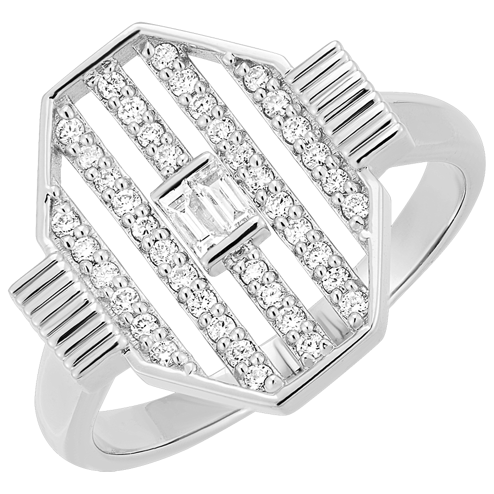 Un majestuoso anillo de oro blanco de diseño audaz. Líneas paralelas engastadas con diamantes y un brillo central dominado por un corazón engastado con diamantes brillantes. Esta joya captura la luz de manera espectacular con cada movimiento.