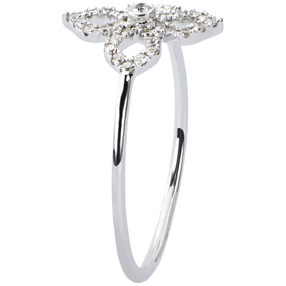 Un motivo floral minimalista con bordes recubiertos y adornado con un diamante en el centro. Un anillo fino y delicado con un toque romántico.