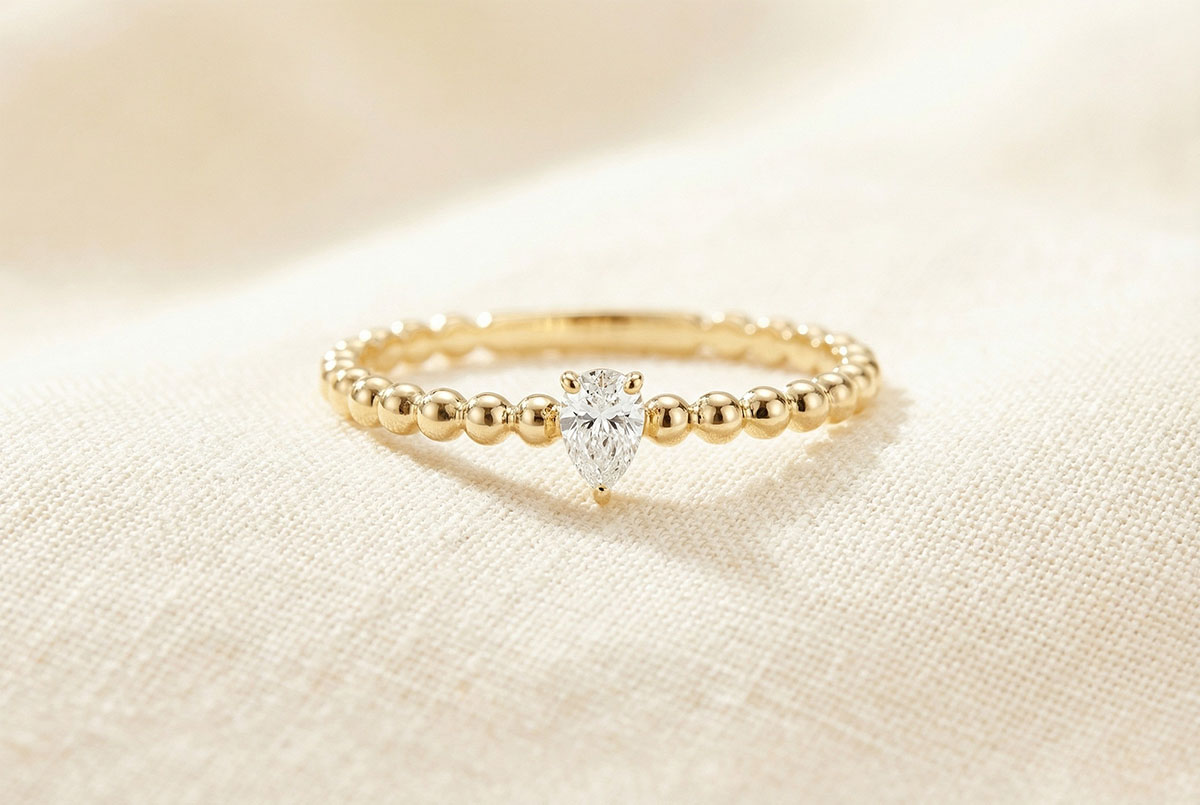 El solitario Burbuja Pera se compone de un delicado diamante talla pera colocado en un anillo de oro amarillo burbujeado para un toque de gracia moderna