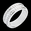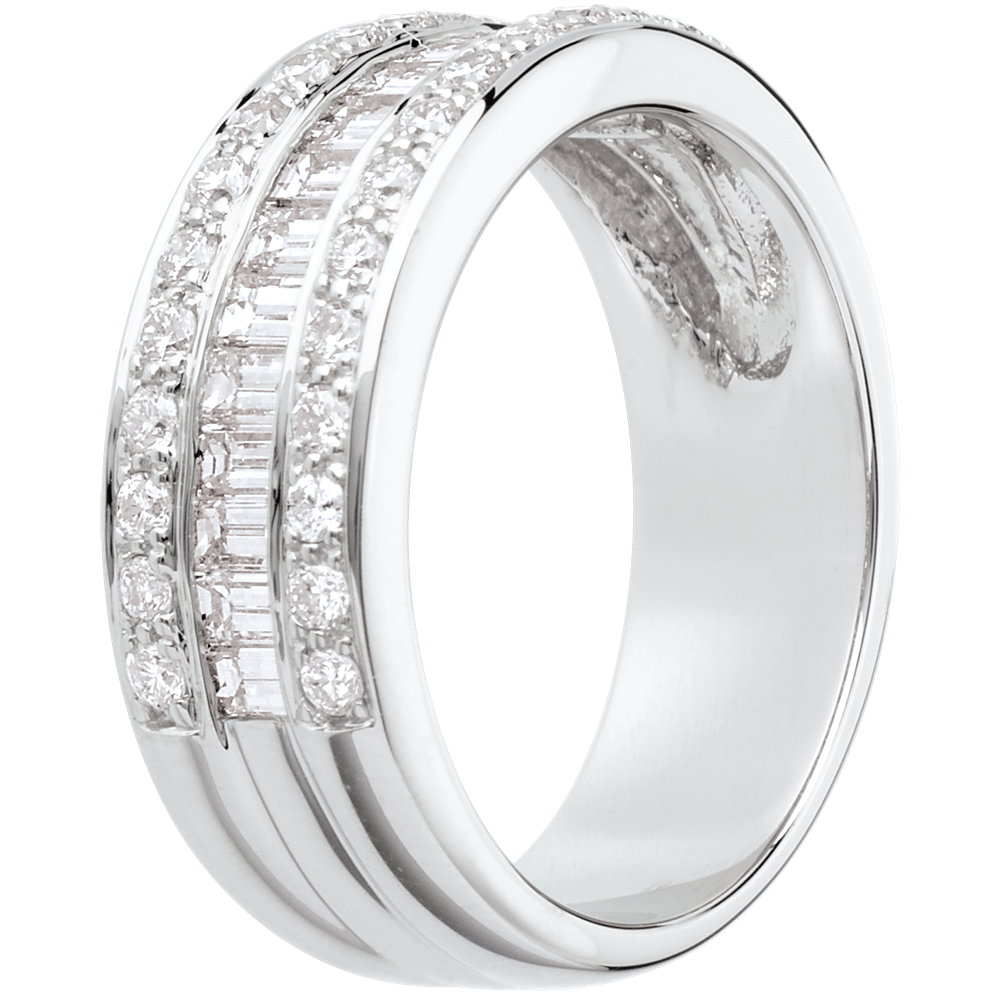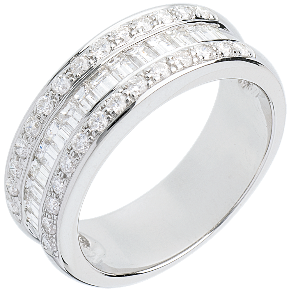 Un anillo de oro blanco montado por 3 filas de diamantes, talla ronda y junquillo, para una montura deslumbrante y distinguida.