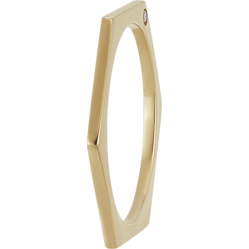 Este anillo minimalista se inspira en la forma hexagonal del panal. Realizado en oro amarillo, está adornado con un único diamante engastado en su borde. Su diseño puro y moderno lo convierte en una joya atemporal.