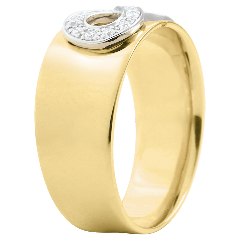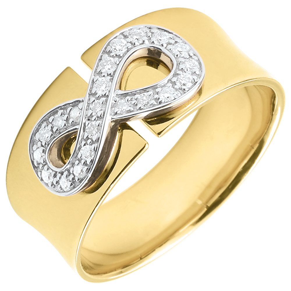 Un signo de infinito en oro amarillo engastado con diamantes se sienta en una montura grande y preciosa. Es el símbolo de la eternidad absoluta