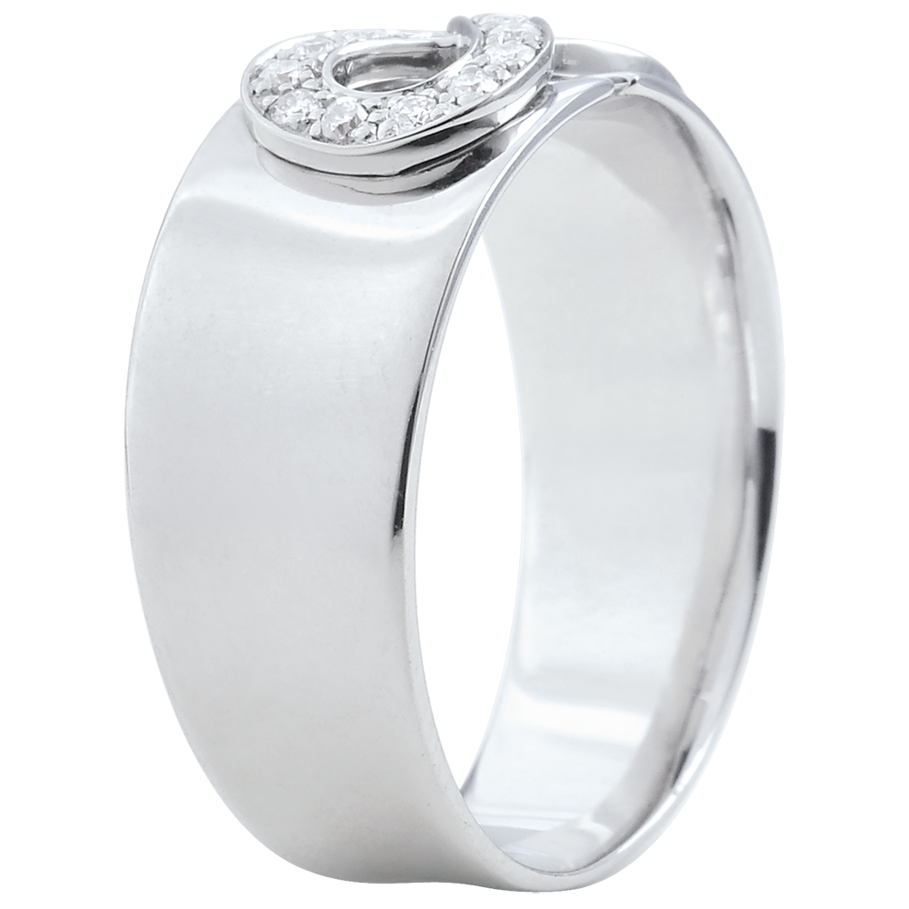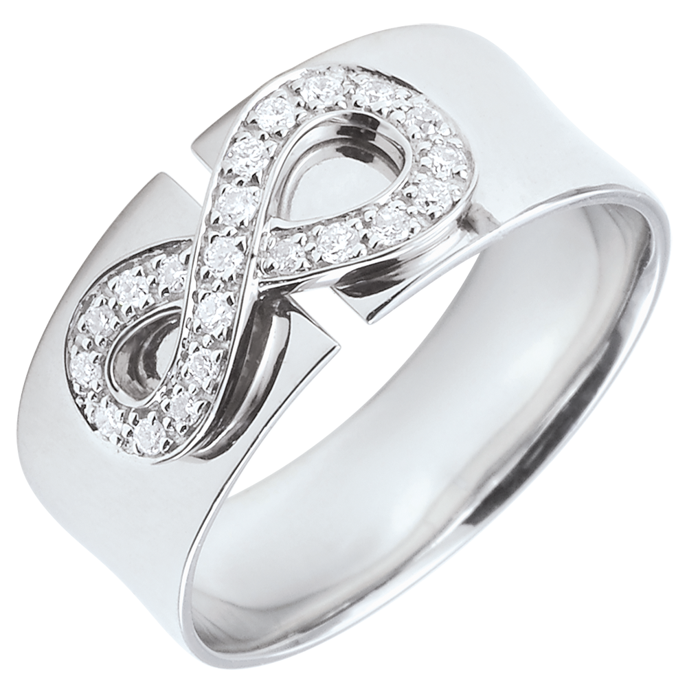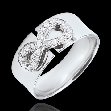 Un signo de infinito en oro blanco engastado con diamantes se sienta en una montura grande y preciosa. Es el símbolo de la eternidad absoluta