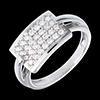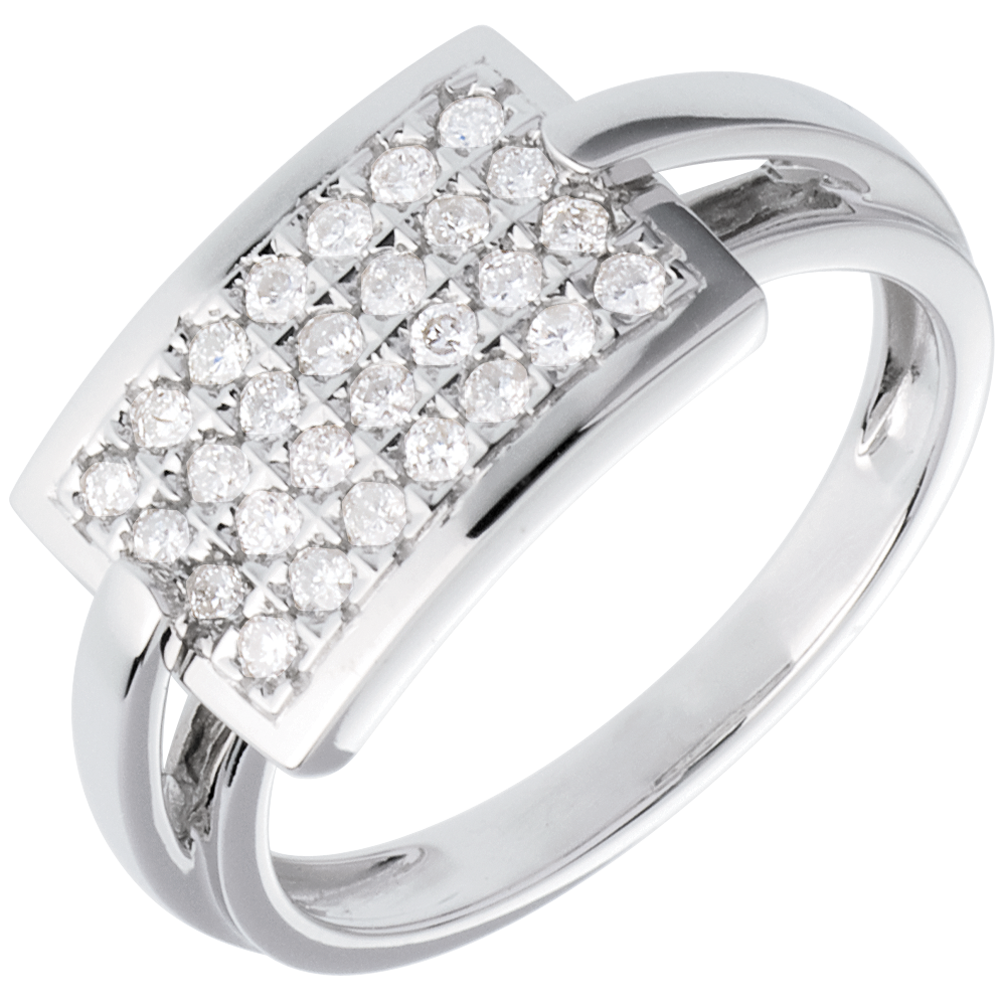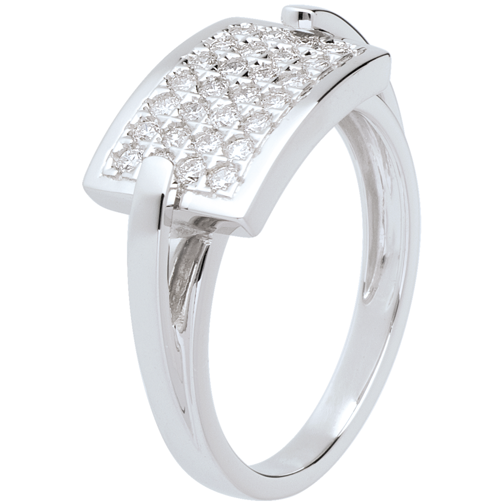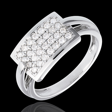 El pavimento geométrico de una placa diamantes, sobrios y gráficos. Un anillo de una gran elegancia y de carácter.