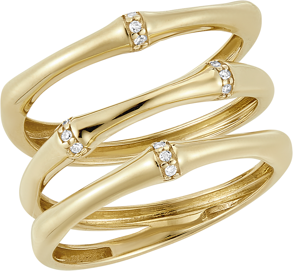 Una rama de bambú fuerte y flexible trepa a lo largo del dedo y se transforma en un anillo eterno. Los nudos de bambú llevan incrustaciones de diamantes en oro.