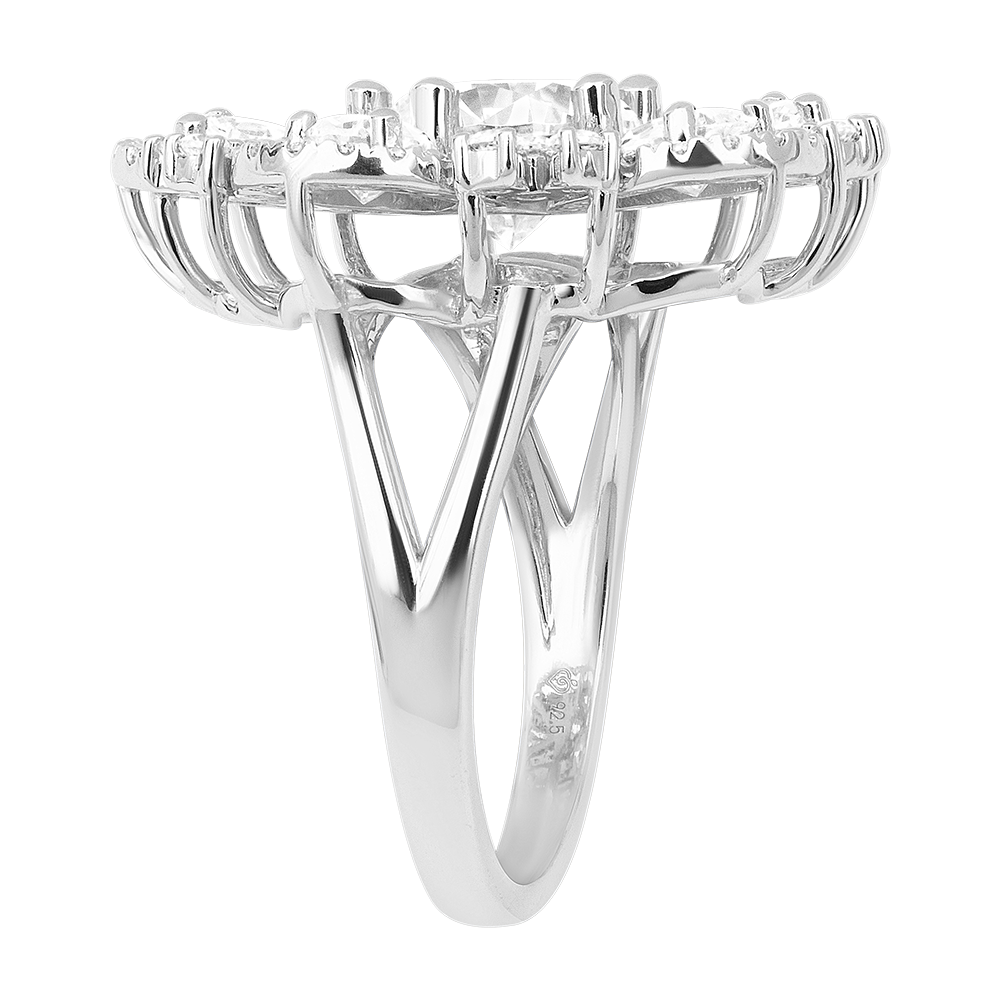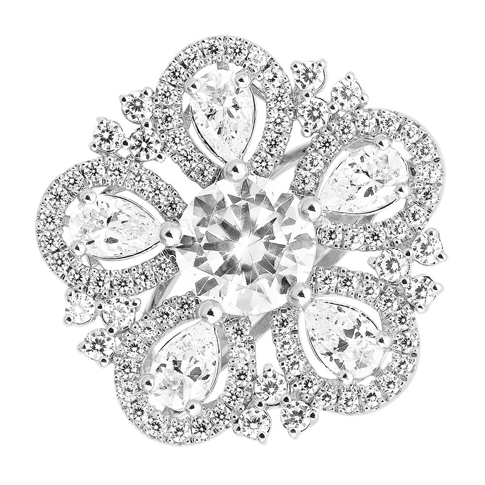 El anillo Lyséa presenta una elegante inspiración floral en oro blanco reciclado 9 quilates. Un diamante central de laboratorio está rodeado por pétalos en forma de pera engastados en pavé, sumando 4,11 quilates.