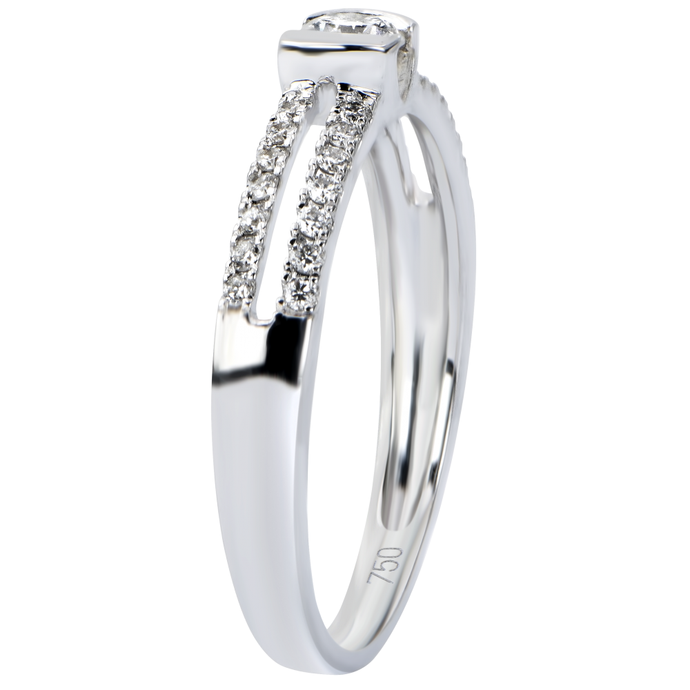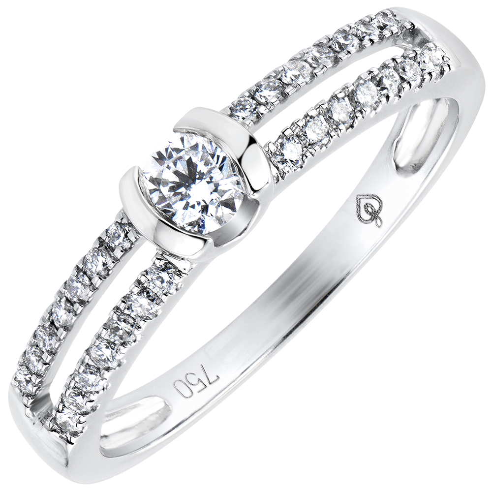 La coronación de un diamante sobre una montura doble engastada con diamantes, regalándonos un anillo noble con un brillo elegante.