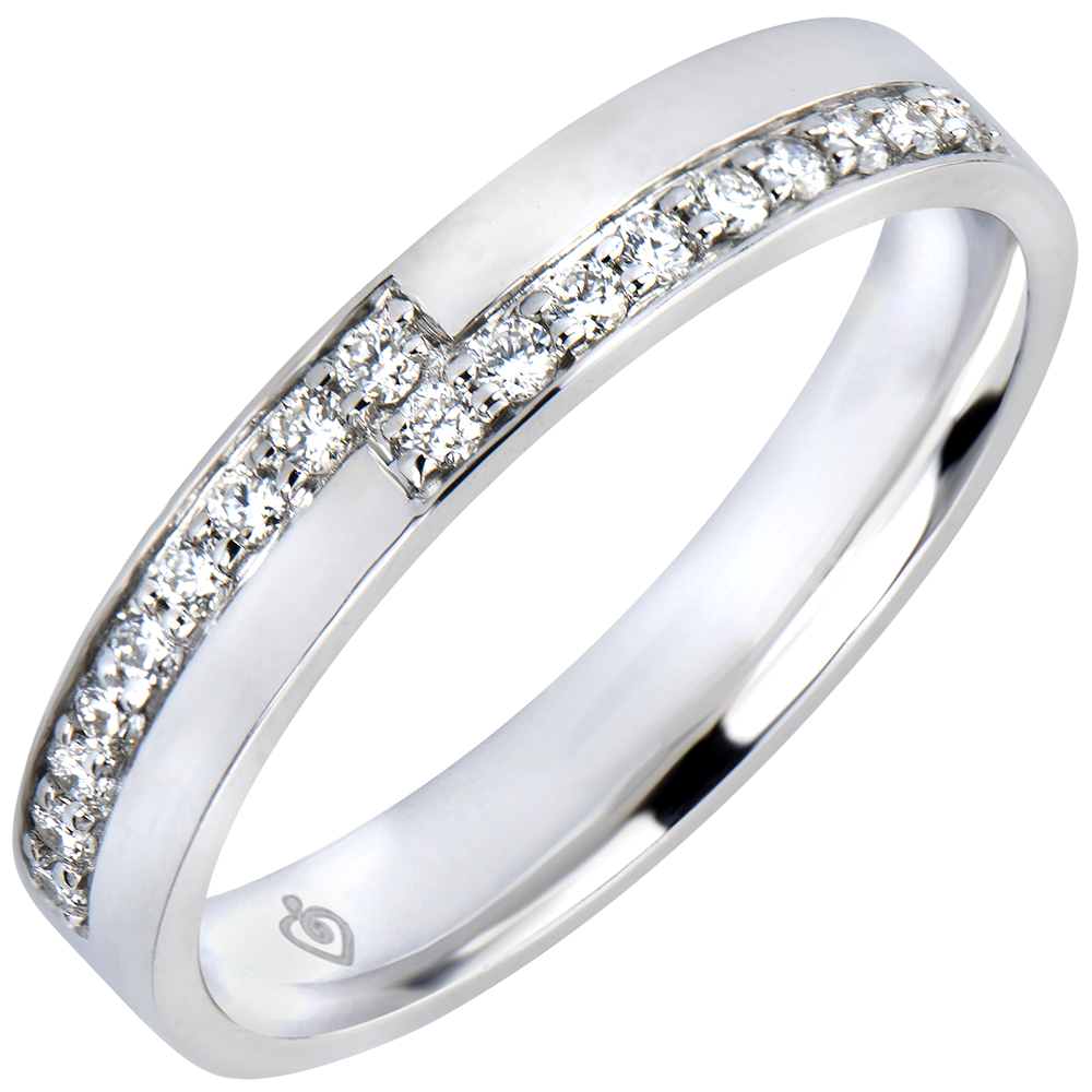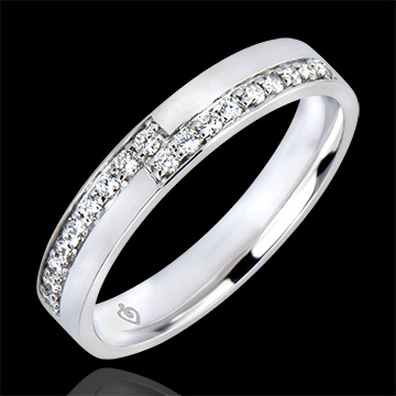 Un Anillo de Matrimonio gráfico que nos recuerda esos contornos de los años setenta, símbolo de enlace y de apego. Oro blanco recubierto de diamantes.