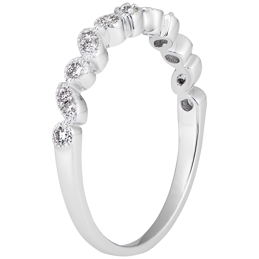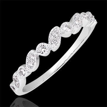 Un anillo con diseño rítmico de empedrados redondos y en almendra, que aportan a esta montura un toque alegre y ligero. Un modelo para usar superpuestos o junto con un Anillo de Matrimonio.
