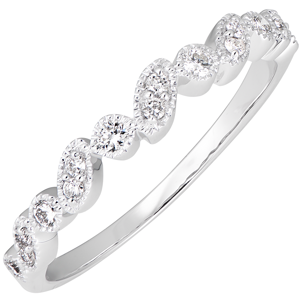 Un anillo con diseño rítmico de empedrados redondos y en almendra, que aportan a esta montura un toque alegre y ligero. Un modelo para usar superpuestos o junto con un Anillo de Matrimonio.
