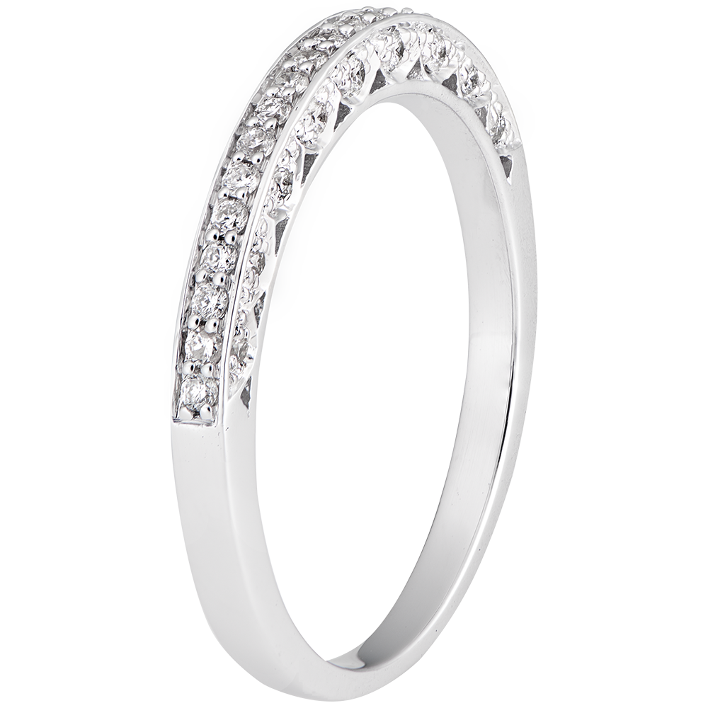 Un anillo de Matrimonio de semi diamantes, que juega con la sutilidad y la originalidad con sus diamantes pequeños engastados en un pedazo de la montura.