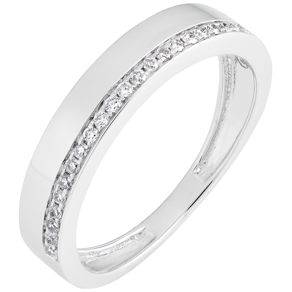 Un Anillo de Matrimonio gráfico compuesto de un anillo pulido y realzado por un semi empedrado de diamantes.
