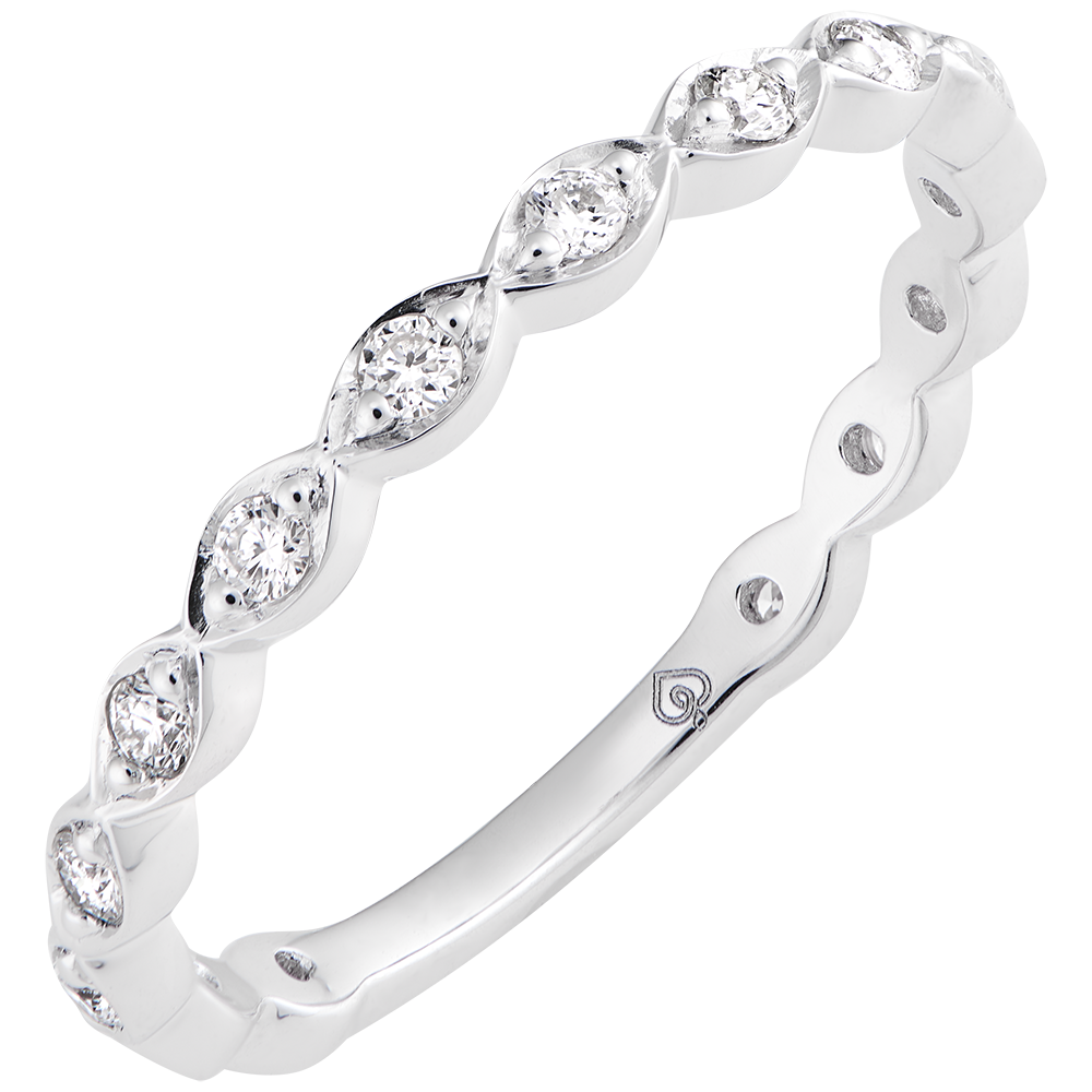 Un anillo compuesto por una sucesión de empedrado en almendra que dan un anillo de formas suaves y refinadas.