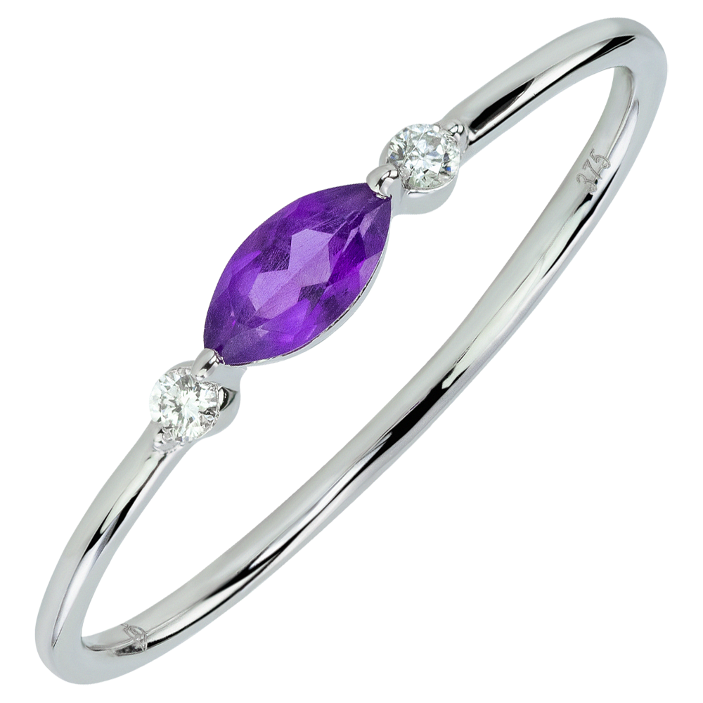 La preciosa pupila simbolizada por un amatista de corte marquesa coronado en el centro de esta fina montura en hilo de oro blanco Está rodeada por dos diamantes que emulan dos lágrimas congeladas para siempre.