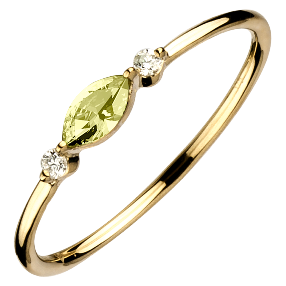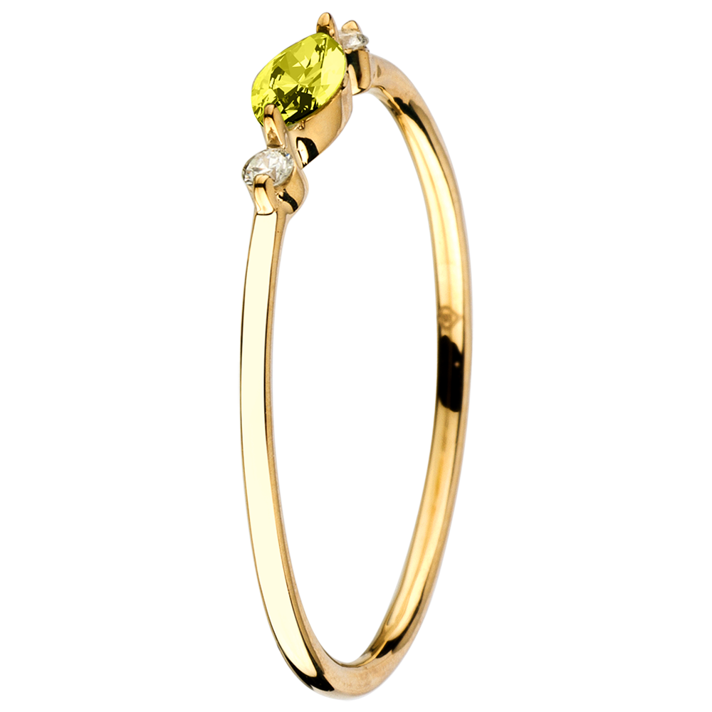 La preciosa pupila simbolizada por un peridoto de corte marquesa coronado en el centro de esta fina montura en hilo de oro amarillo. Está rodeada por dos diamantes que emulan dos lágrimas congeladas para siempre.