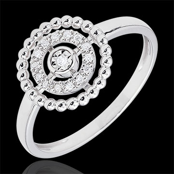 Un circulo de perlas de oro enmarcados por un circulo de diamantes y un solitario en su centro.