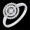 Un circulo de perlas de oro enmarcados por un circulo de diamantes y un solitario en su centro.