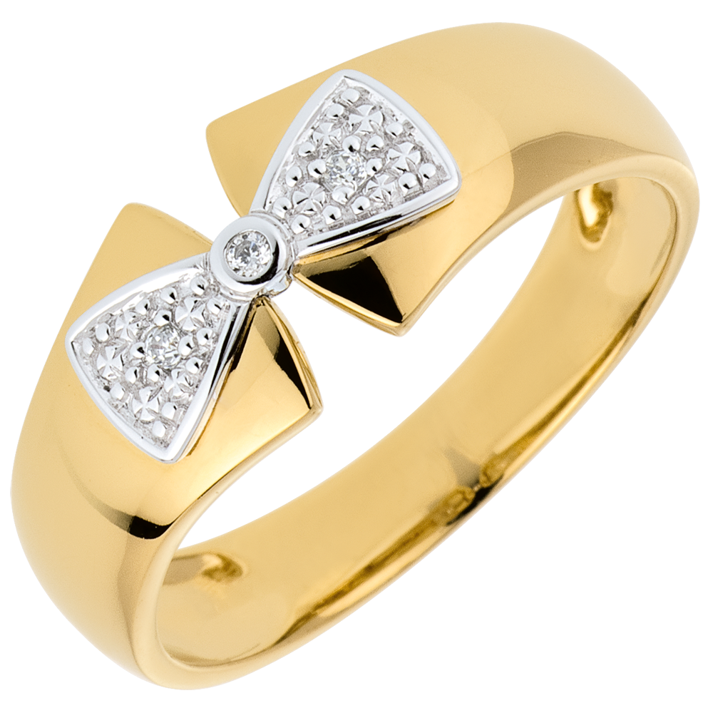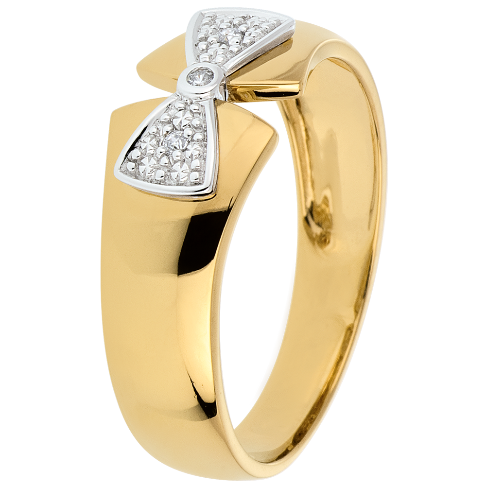 Una cinta de oro amarillo es cerrada por un nudo de oro blanco y diamantes para cercar su dedo.