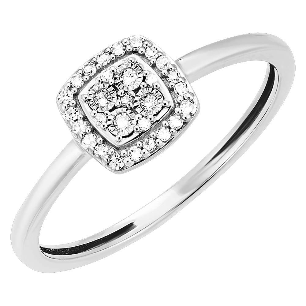 El destello de un pavé de diamantes cuadrados, coronado con un halo de diamantes y delicadamente colocado en una banda de oro blanco. Un anillo de oro blanco fino y sutil, impregnado de elegancia atemporal.