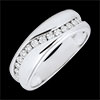 Un anillo de oro blanco es surcado por una curva suave en la que se reinan 15 diamantes.