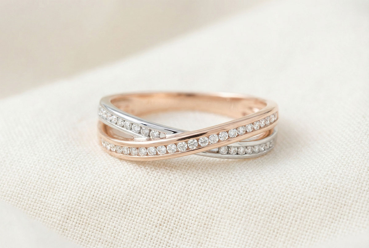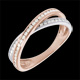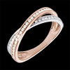 Dos anillos engastados por diamantes se unen para formar este anillo de oro rosa y de oro blanco. Esta joya puede también bien llevarse como alianza o en anillo de excepción.