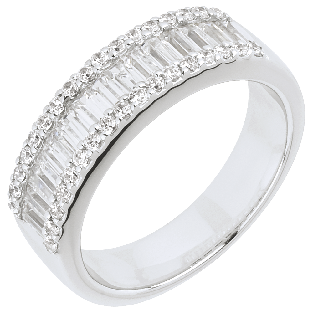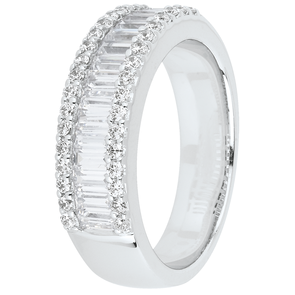 Tres hileras de diamantes, de tallas brillante y baguette, crean un efecto estructurado y sofisticado sobre un arco de Oro Blanco.