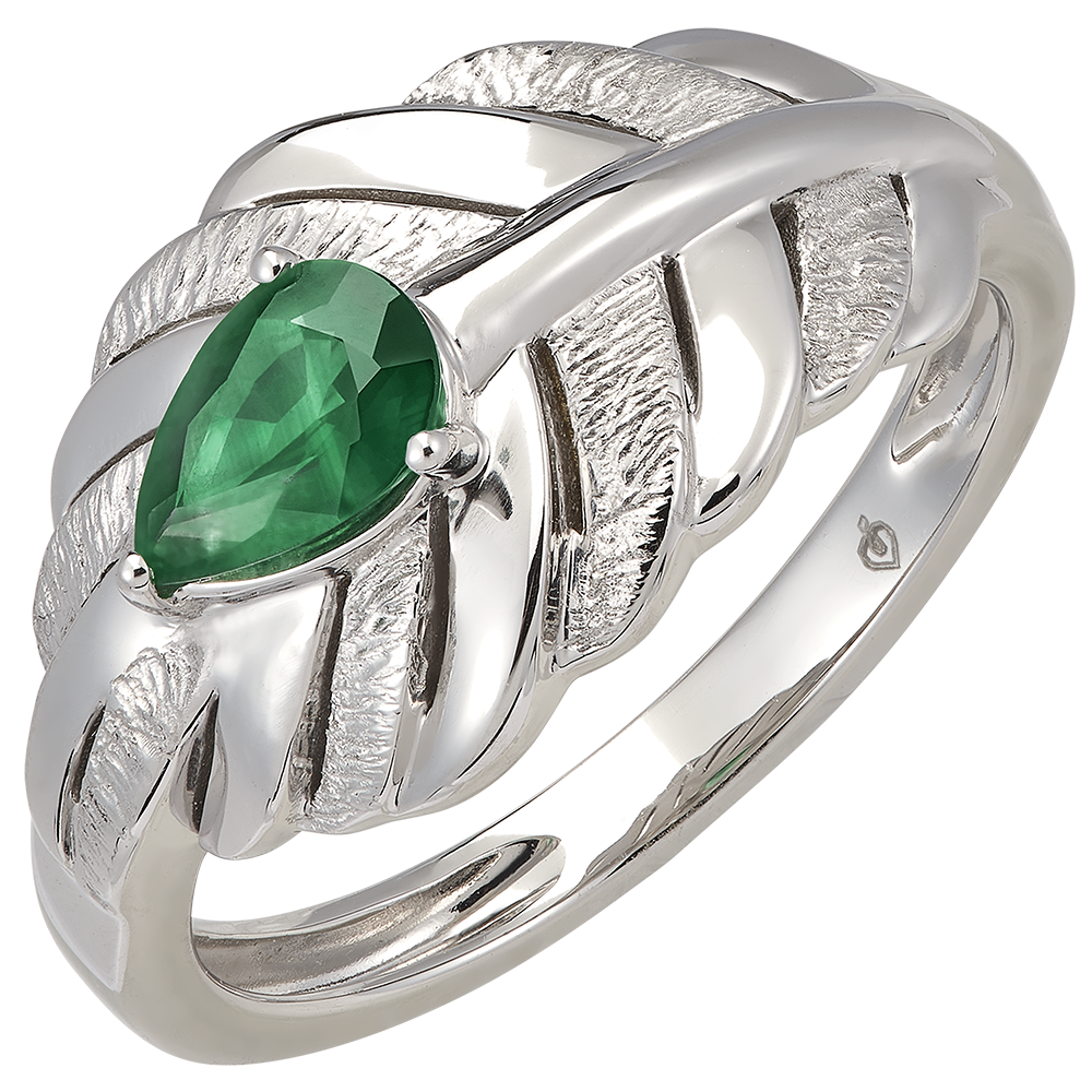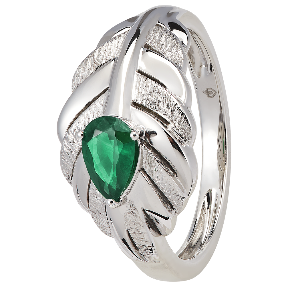El anillo Altesa en oro blanco de 18 quilates realza una esmeralda sintética central, de 0.35 quilates, de forma de pera. Su diseño inspirado en la pluma encarna perfectamente la elegancia y el refinamiento de la colección Panache.