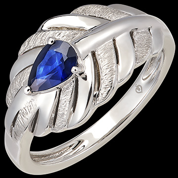 El anillo Altesa en oro blanco de 9 quilates realza un zafiro sintético central, de 0.45 quilates, de forma de pera. Su diseño inspirado en la pluma encarna perfectamente la elegancia y el refinamiento de la colección Panache.