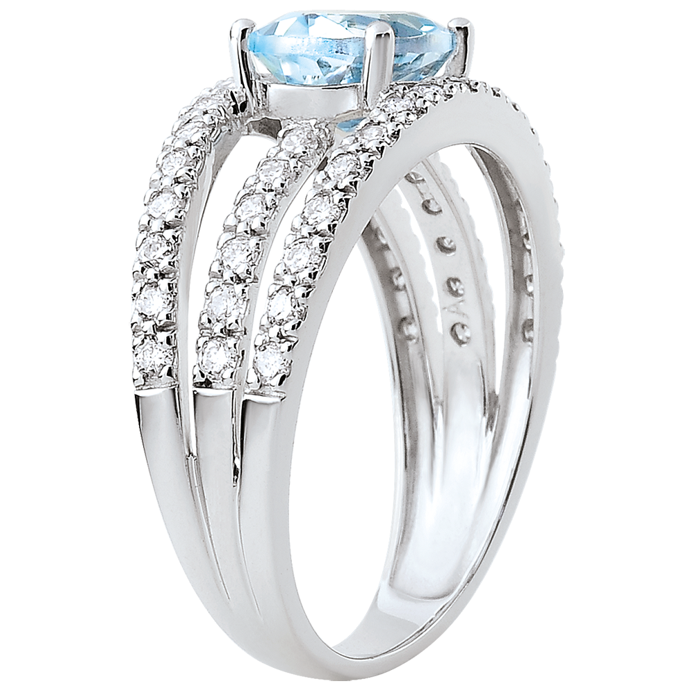 Un montura arquitectónica compuesta de tres anillos de oro blanco y diamantes que hacen brillar el topacio central.