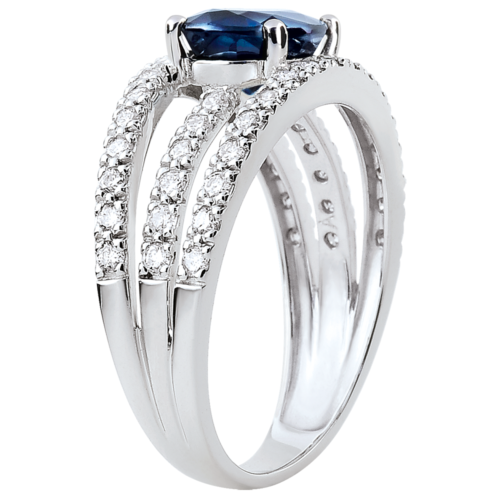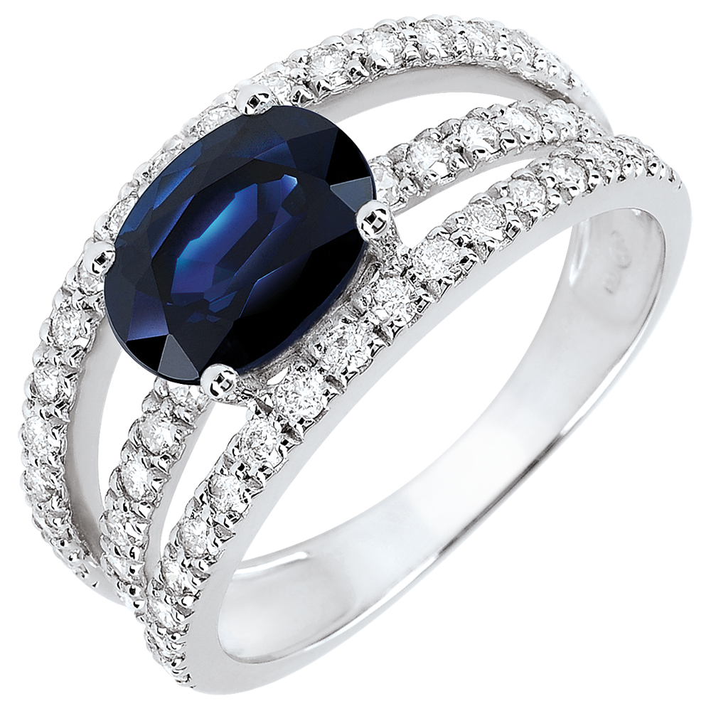 Un montura arquitectónica compuesta de tres anillos de oro blanco y diamantes que hacen brillar el zafiro central.