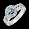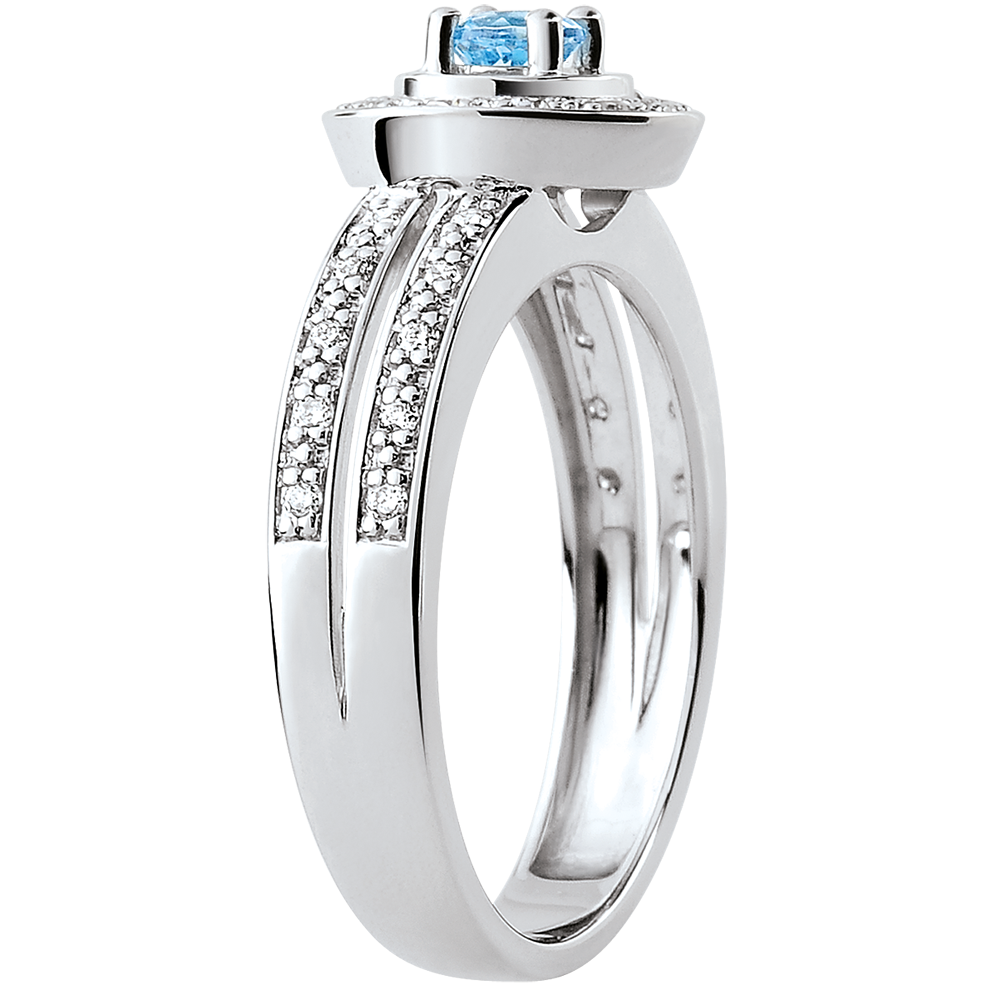 Un topacio central que resalta sobre un anillo doble de oro blanco rodeado de diamantes. .
