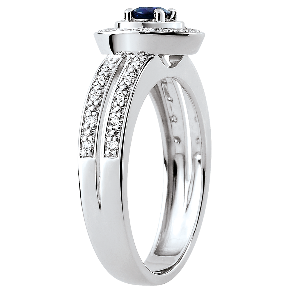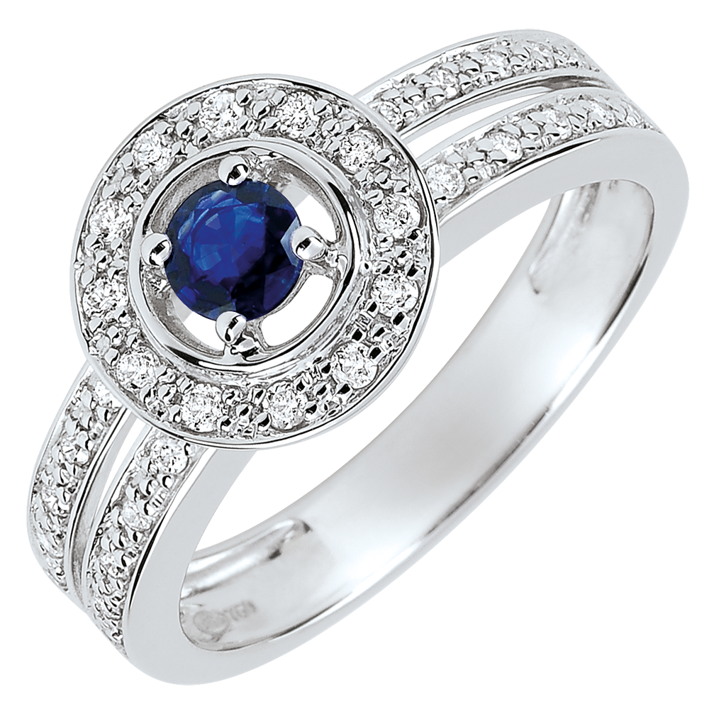 Un zafiro central que resalta sobre un anillo doble de oro blanco rodeado de diamantes.