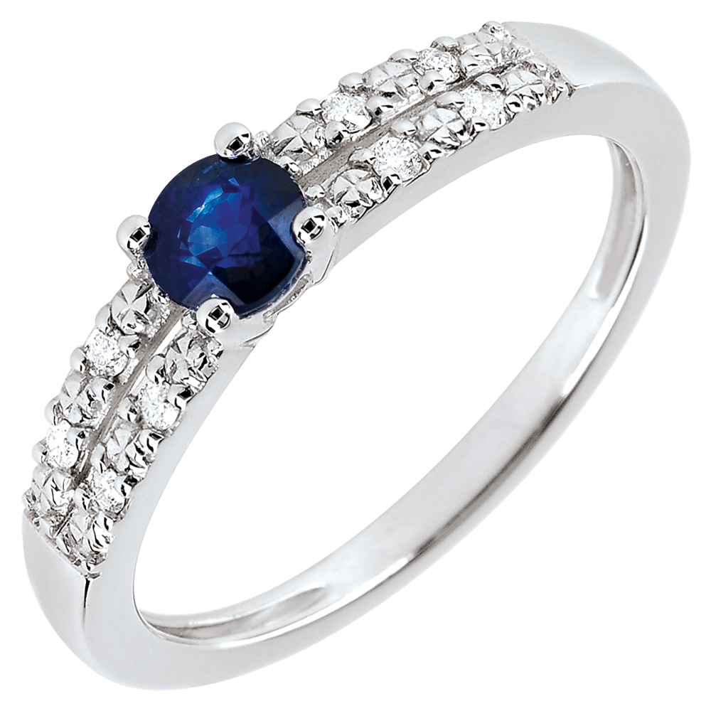 Una pieza que transmite pureza y sencillez. Un anillo de oro blanco y diamantes, coronado por un zafiro central.