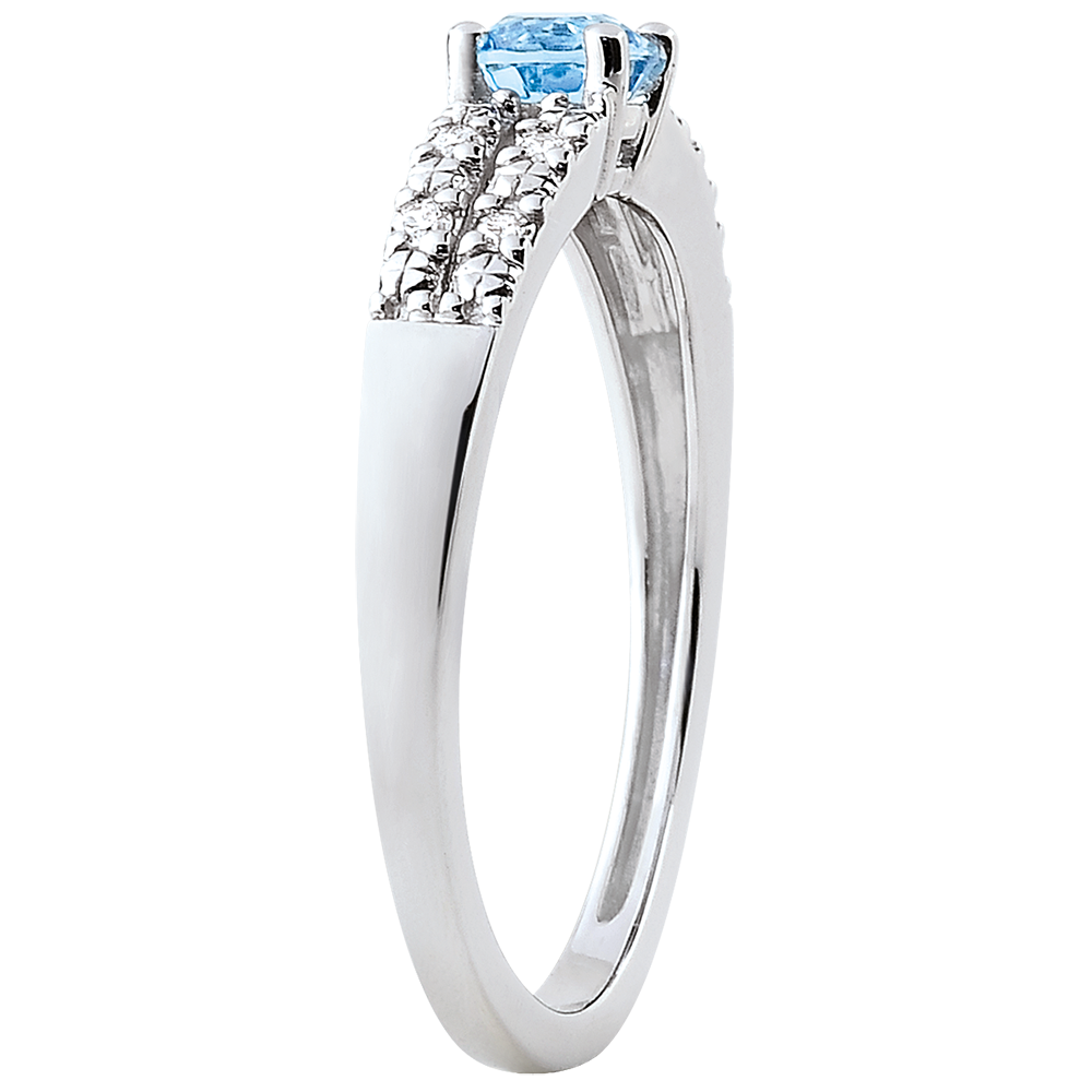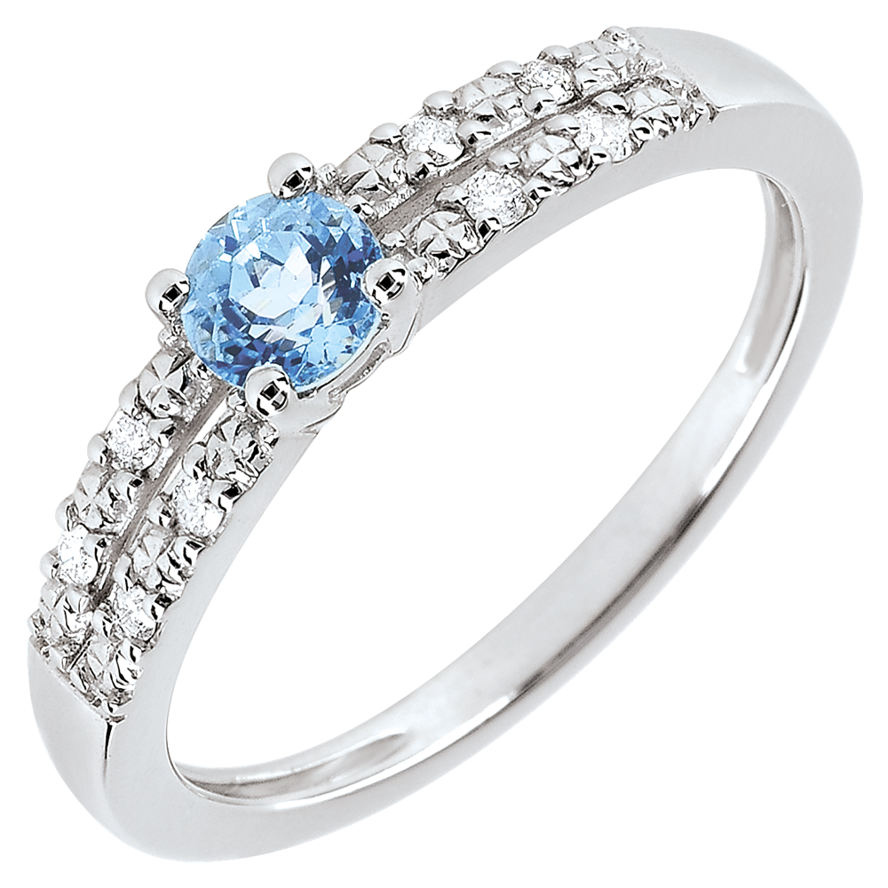 Una pieza que transmite pureza y sencillez. Un anillo de oro blanco y diamantes, coronado por un topacio central.