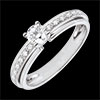 Un diamante solitario engastado entre 4 garras corona una montura de Oro Blanco con diamantes en talla brillante.