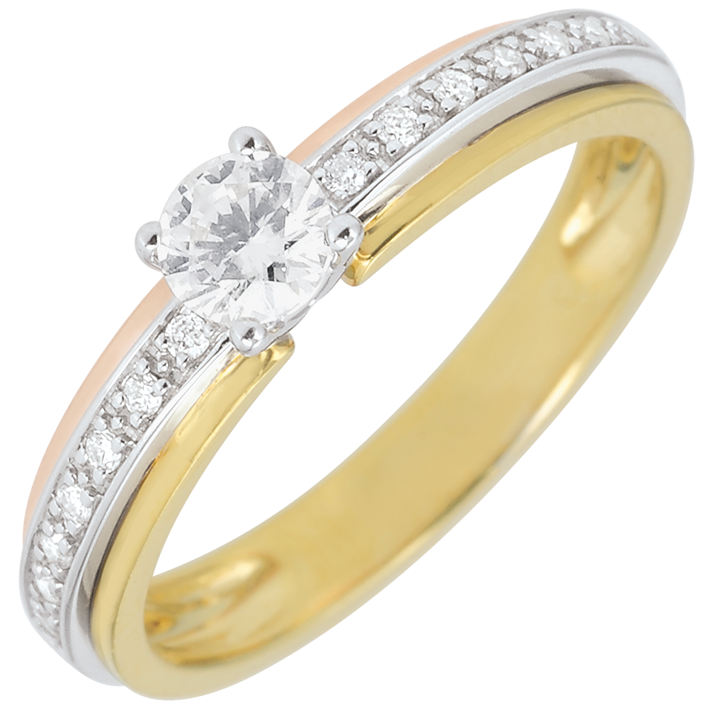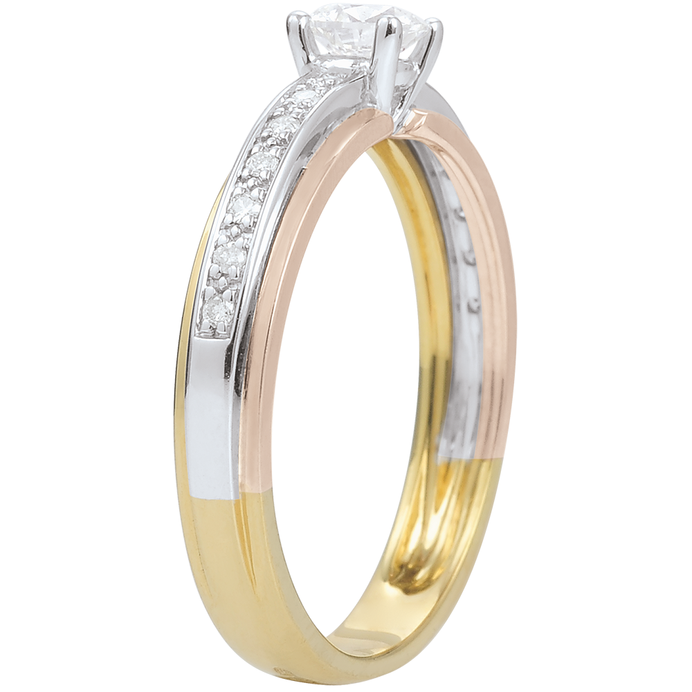 Un diamante solitario engastado entre 4 garras corona una montura de tres oros con diamantes en talla brillante.