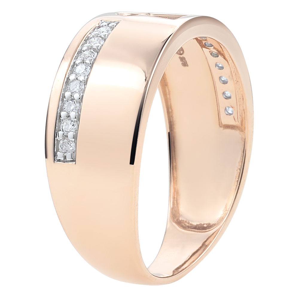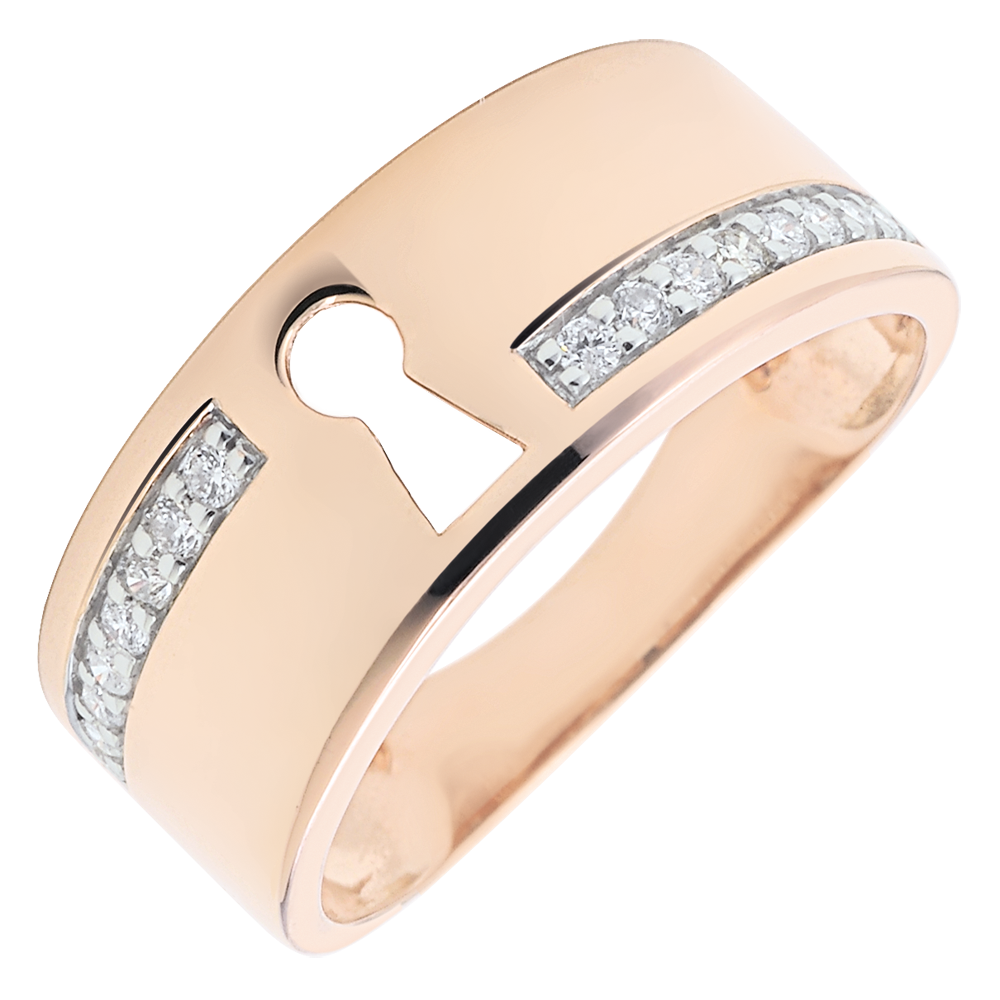 Una cerradura reina esta ancha montura de oro rosa salpicada de diamantes.