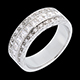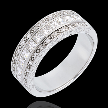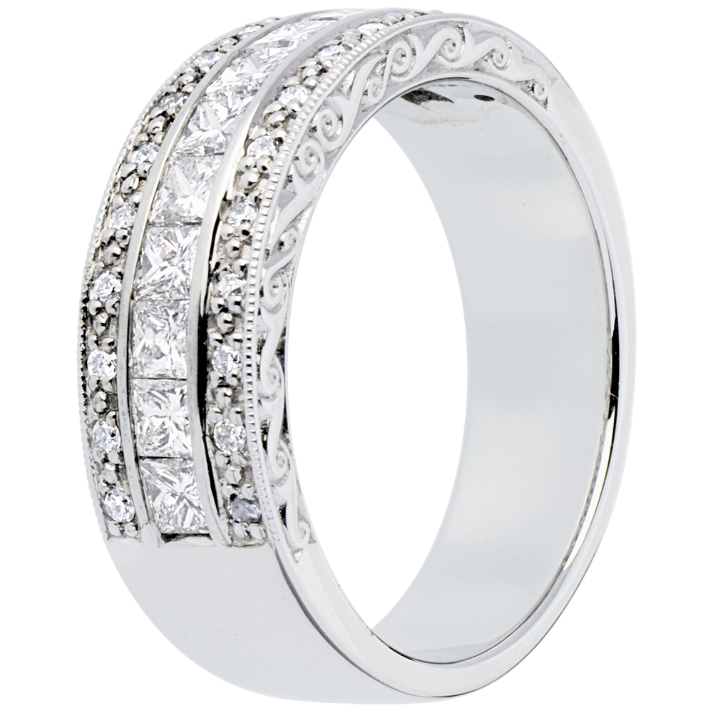 Un anillo sublime con 3 filas de diamantes, diamantes de talla princesa en la hilera central y en aquellas que arropan a esta diamantes con engaste de grano que realzan el brillo de los diamantes que se hallan en el centro. Un anillo suntuoso a la par que sobrio.