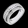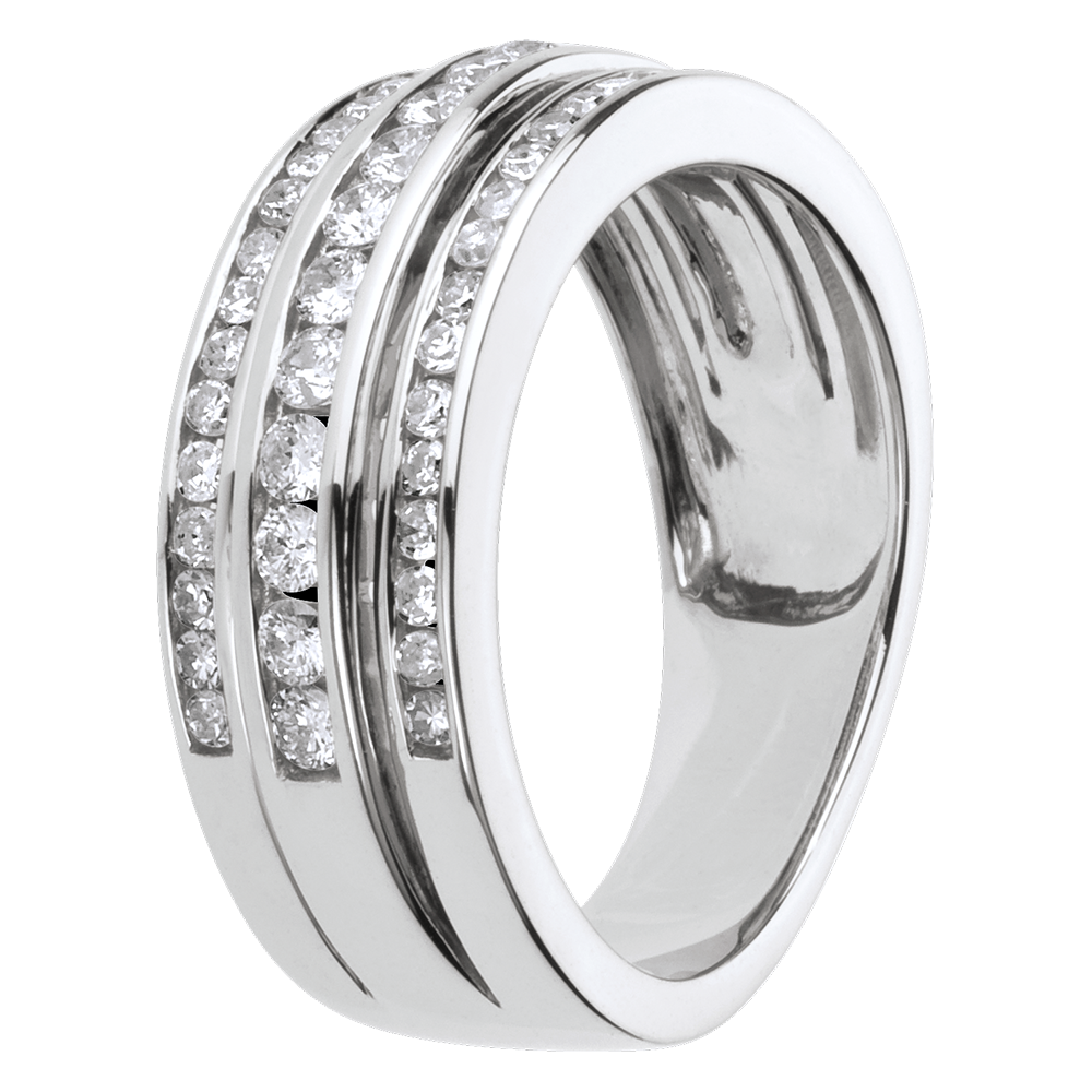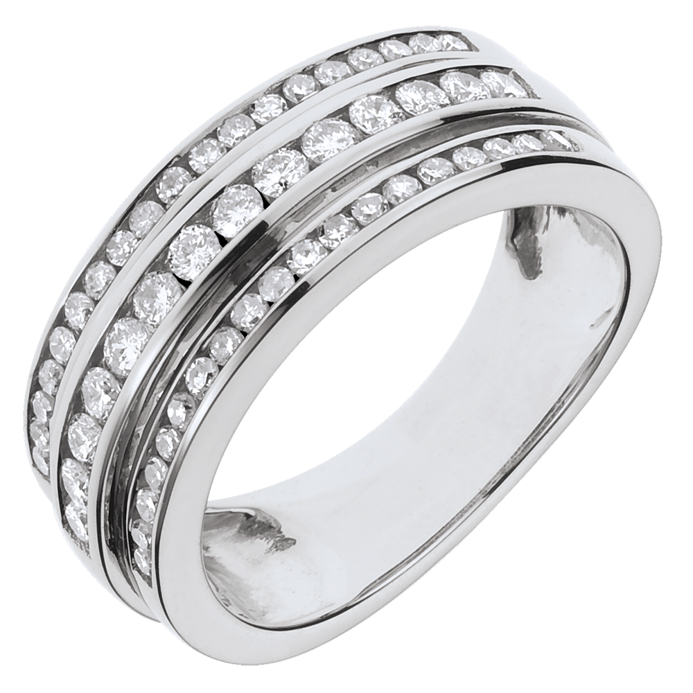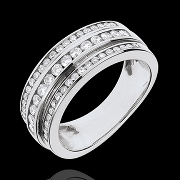 Tres filas de diamantes engastados en raíles de oro blanco crean un efecto de volumen radiante al jugar con el tamaño de las piedras.