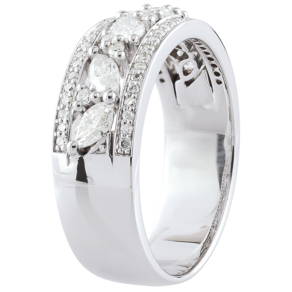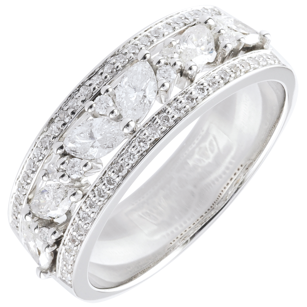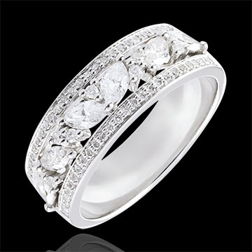 Un aro ricamente decorado con diamantes gravita alrededor de un amplio aro de Oro Blanco.