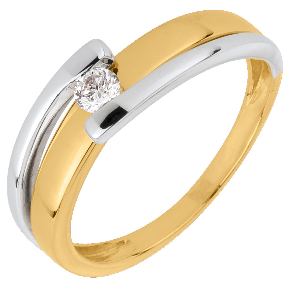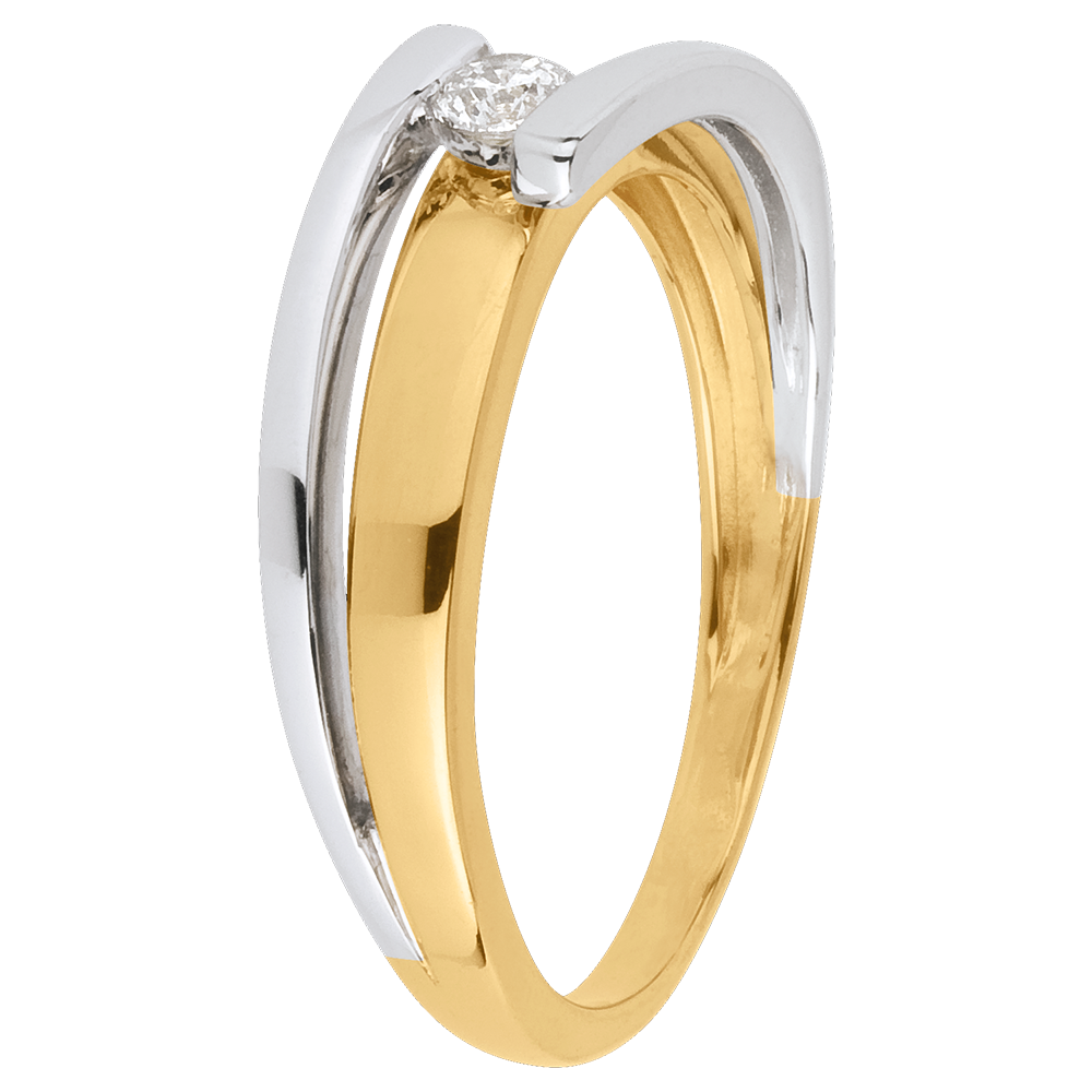 Un anillo de oro amarillo es estrechado por dos brazos de oro blanco que tienen un diamante.