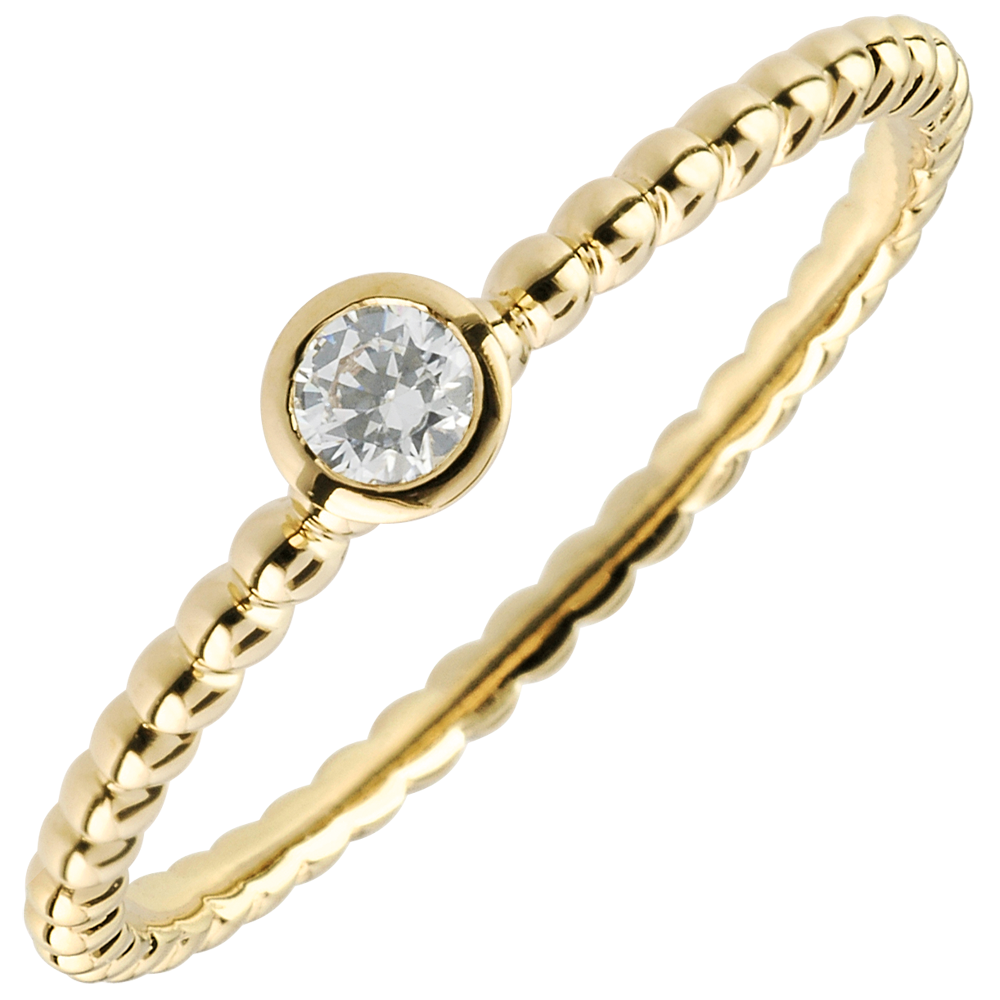 Una miríada de perlas de oro se suceden para acompañar un diamante solitario con engaste de bisel. Un anillo de compromiso moderno y femenino.