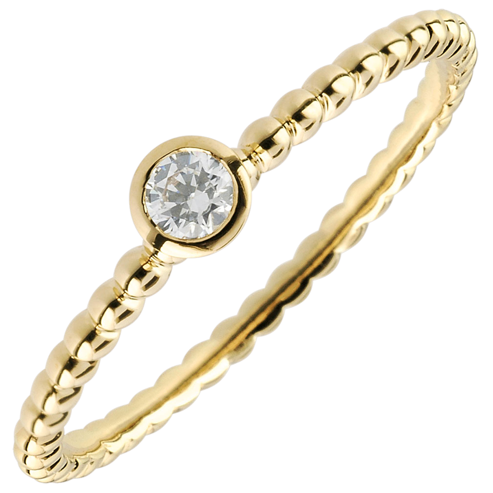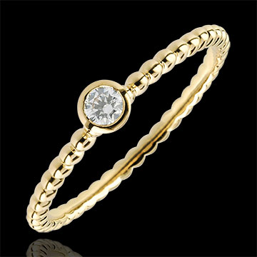 Una miríada de perlas de oro se suceden para acompañar un diamante solitario con engaste de bisel. Un anillo de compromiso moderno y femenino.