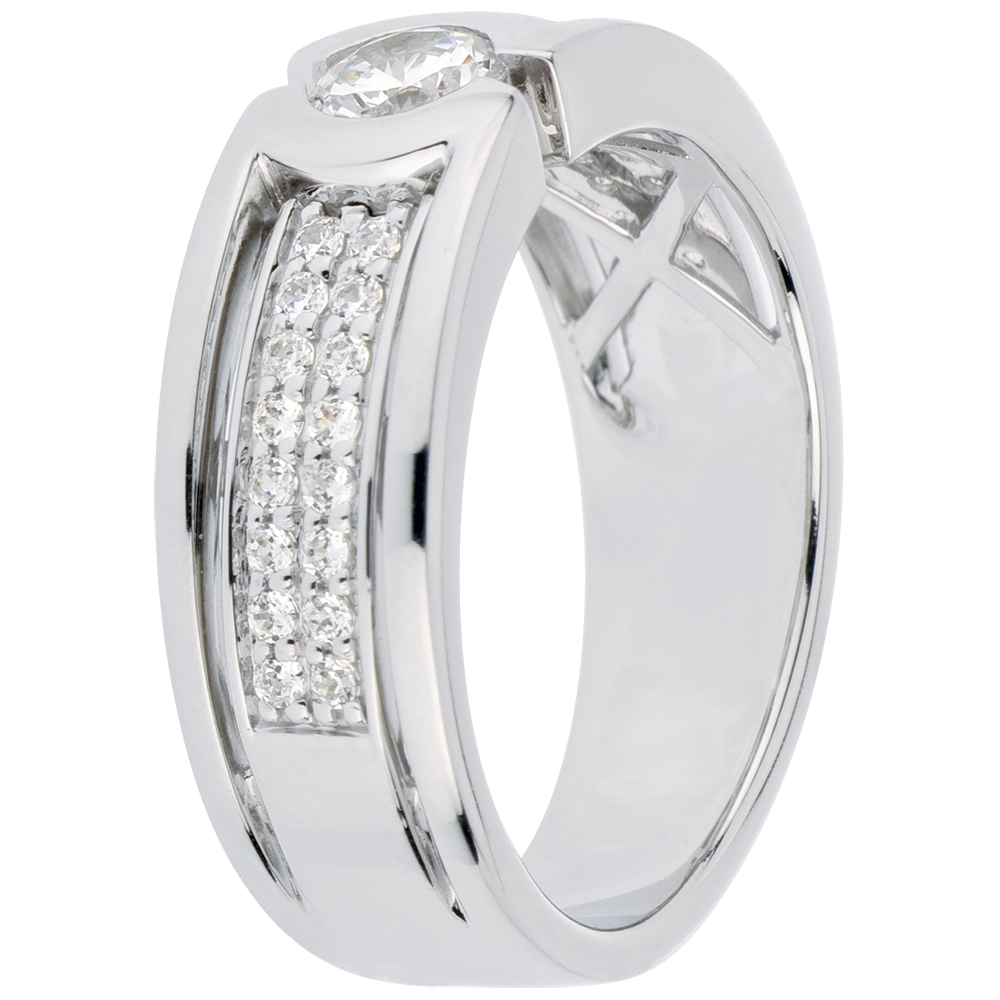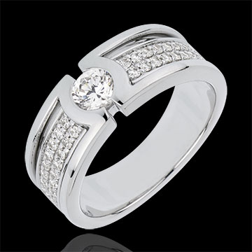 Un solitario atrapado en una montura sublime rociada con diamantes de talla brillante.