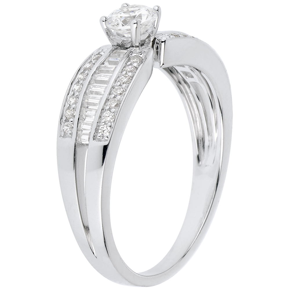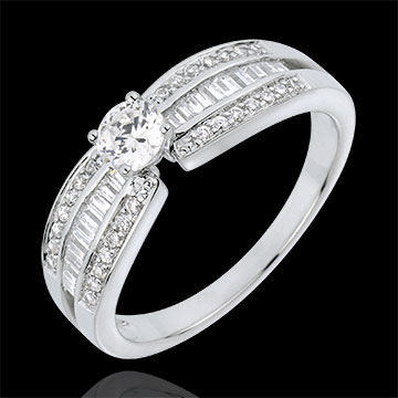 Un diamante solitario engastado entre 4 garras corona una lujosa montura pavimentada de diamantes talla brillante y talla baguette.