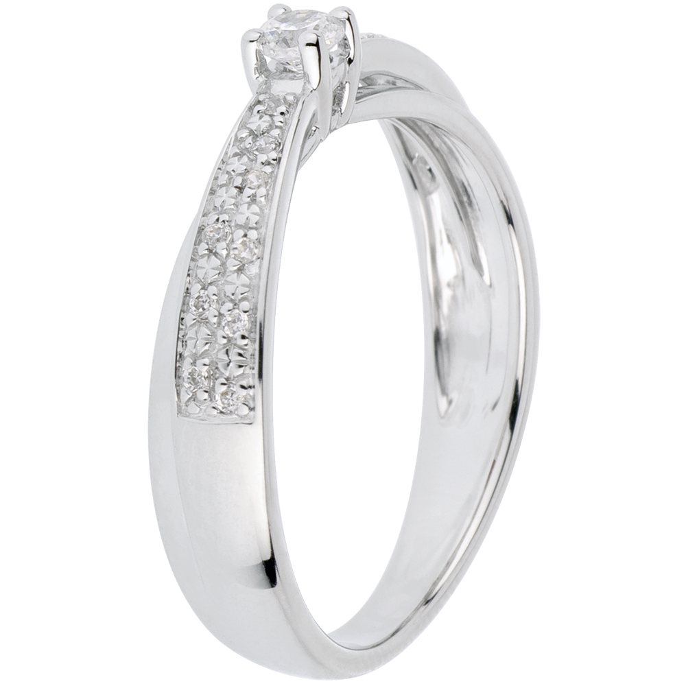 Un diamante solitario engastado entre 4 garras corona una lujosa montura con diamantes talla brillante. Un anillo de compromiso en Oro Blanco y diamante que une clasicismo y originalidad.