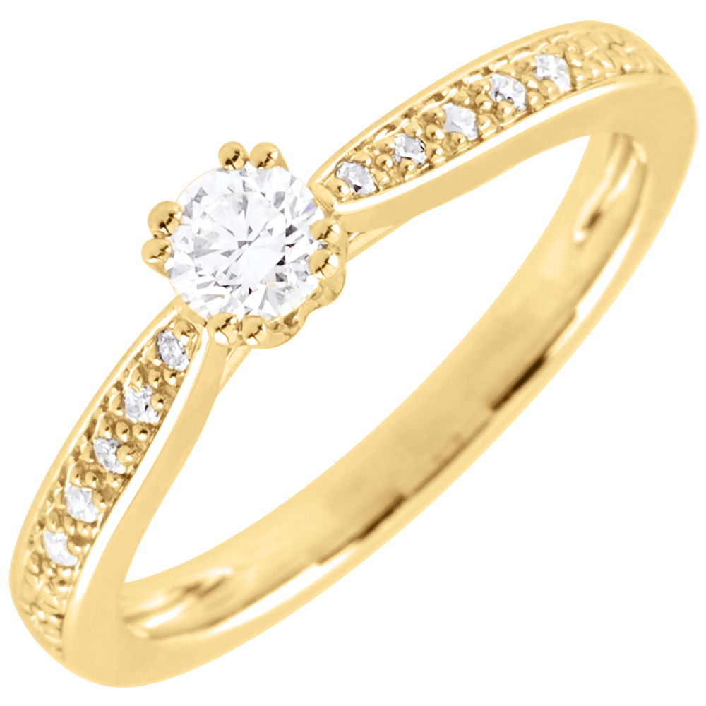 Un diamante solitario engarzado por 8 garras sobre una montura fina cubierta de diamantes.