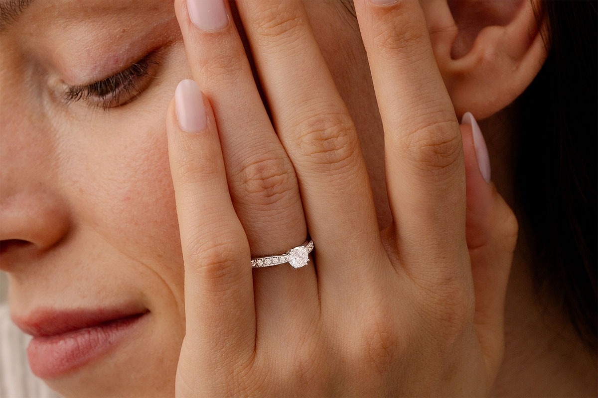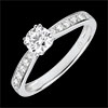 Son necesarias 8 garras para sostener este delicado diamante que protagoniza un anillo solitario acompañado de oro blanco y diamantes.