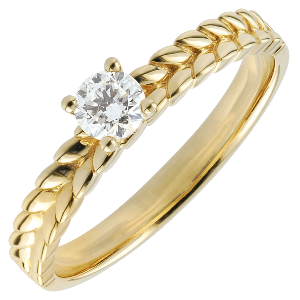 Un precioso diamente solitario que resposa sobre una montura de hojas de oro entrelazadas. Un anillo de compromiso original y refinado.